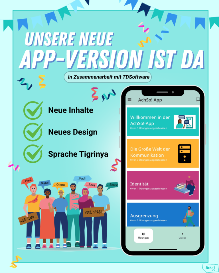 Im März 2025 haben wir mit der Erarbeitung der Sprachversion Tigrinya für die AchSo!-App begonnen. Dabei unterstützen uns zwei neue Kollegen, über deren Mitwirkung wir uns sehr freuen. In Workshops mit Mitgliedern der Tigrinya-sprechenden Community entwickeln wir Inhalte, die sich eng an deren konkreten Bedürfnissen orientieren. Erste Übungen wurden bereits kultursensibel übersetzt, in Kürze folgen Videos, unsere „Praktischen Tipps“, in Tigrinya.